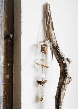 Na jutovém provázku jsou navlečené bílé mušle a kousky dřívek. Při slabém větru mušličky o sklo zní a navozují tak úžasnou atmosféru dovolené u moře.